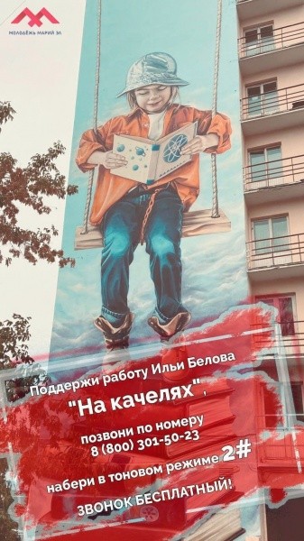Напомним, по результатам отборочного этапа фестиваля в финал вышли 14 лучших изображений, в том числе и граффити Ильи Белова. Финалисты нарисовали свои работы на зданиях родных городов. В Йошкар-Оле масштабное полотно "На качелях" украсило фасад девятиэтажного студенческого общежития на бульваре Победы.