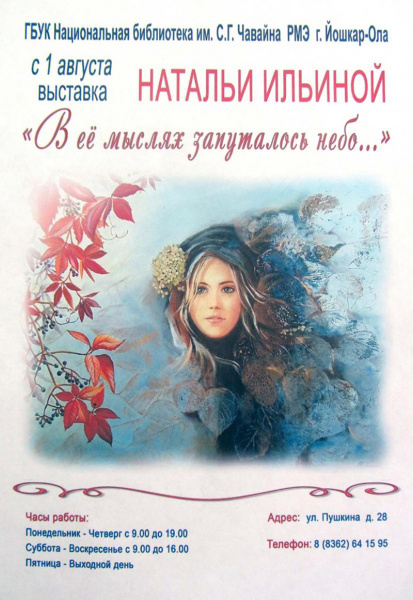 4 сентября в Национальной библиотеке им. С.Г. Чавайна открывается художественная выставка Натальи Ильиной, работы которой заряжают позитивной энергией, дарят радость и ощущение счастья.