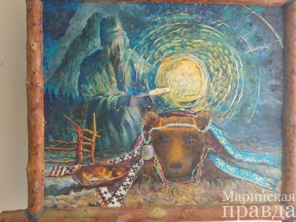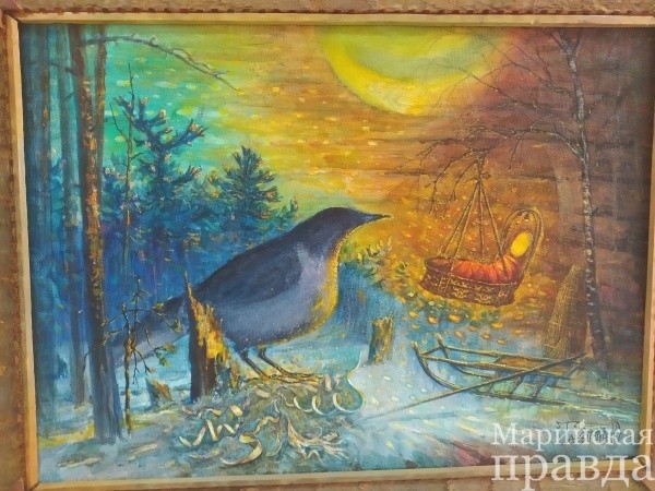 И вот на международной выставке в 1993 году в Сыктывкаре он познакомился со своей будущей женой, художницей из Башкирии Натальей. Потом были долгие годы «любви на расстоянии» – переписывались. Юрий Иванович в интервью нашей газете утверждает, что инициатива переезда в Югру в 2001 году принадлежит именно Наталье, сам бы он не решился. Конечно, за любимой можно на край света, но, думаю, художника поманила и романтика севера, возможность расширить границы творчества, найти и отразить этническую связь между родственными народами мари, ханты и манси. Одна из последних картин «На женитьбу», написанная перед свадьбой, стала пиком его успеха «марийского периода».Следующий этап его творчества «югорский», вернее, финно-угорский, потому что марийский этнос не ушел даже из картин, основанных на преданиях народов севера. К примеру, на картине «Праздник медведя», написанной в 2002 году по преданию народа ханты, посетители выставки могут увидеть и марийские символы. Меня лично впечатлила великолепная картина этнофутуриста «Вороний день».