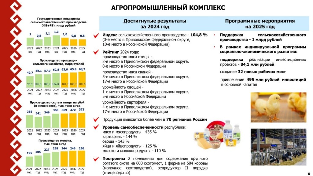 По итогам прошлого года объем сельскохозяйственной продукции Марий Эл составил 63 миллиарда рублей и индекс производства увеличился до 104,8 процента. В рейтинге АПК наша республика заняла третье место по ПФО и десятое – среди всех российских регионов.