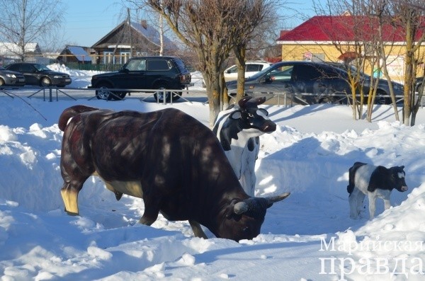Прямо на лужайке перед офисом новоторъяльской сельхозартели «Первое мая» стоит скульптурная группа в натуральную величину. Это коровье семейство: папа (бык), мама (буренка) и ребенок (теленочек).