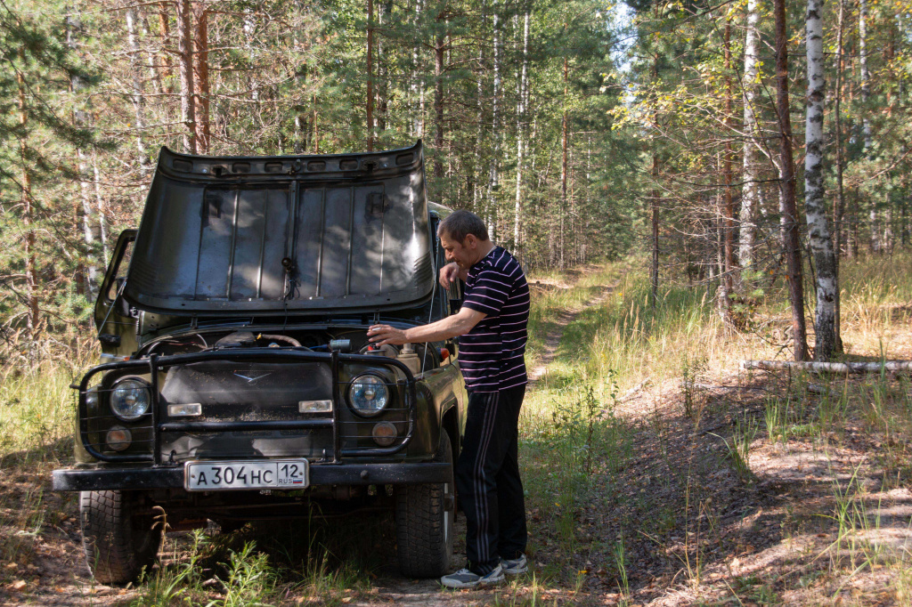 Утром мы двинулись в путь. Дождей не было уже полмесяца, и машина, оставляя за собой облако пыли, быстро пролетела по щебенке до Абросимова. Миновав деревню, мы въехали на лесную дорогу. Впрочем, назвать ее «дорогой» можно было только условно: две колеи петляли среди деревьев, и машина то ныряла в канаву, то выбиралась наверх, натужно гудя на подъеме. На каждой яме я только крепче прижимал к себе сумку с фотоаппаратом. Уж на что приспособлен «уазик» для бездорожья, а все равно пришлось несколько раз останавливаться (IMG_8378). Перегревался бензонасос, и Николай, хозяин машины, как к больному, прикладывал к нему мокрые тряпки, чтобы сбить температуру.По тому, как курил наш водитель, было видно, насколько правильный и основательный он человек. Досмолив сигарету, Николай тормозил, клал окурок в колею и каблуком тщательно втаптывал его в песок. «Лесник потомственный, знает, как себя в лесу вести» – похвалил нашего спутника Валерий Александрович. – Тут в 1972 году такие пожары были, что до сих пор страшно вспоминать».