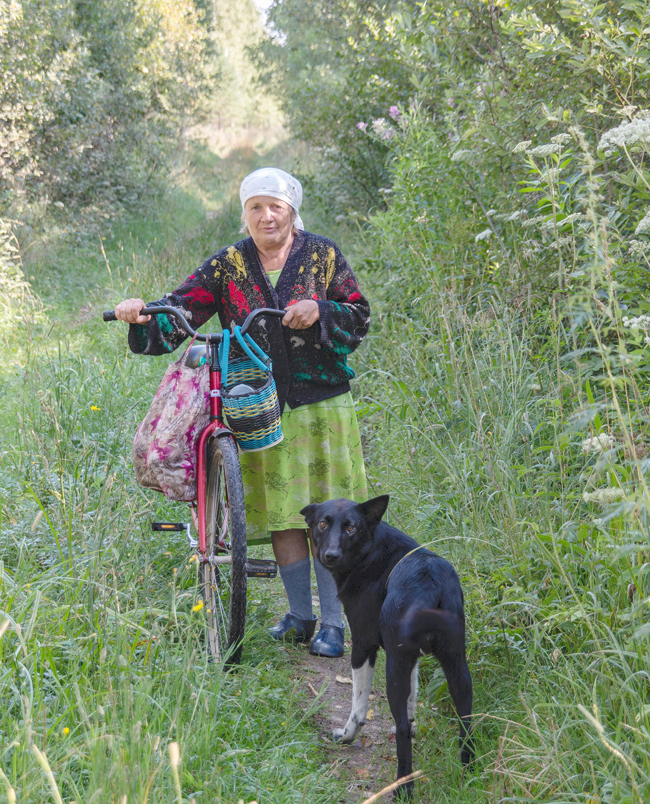 Едва мы миновали Кугай, как впереди в высокой траве блеснуло что-то металлическое, а потом показался велосипед, который катила перед собой немолодая женщина. Рядом бежала черная дворняга. Она словно бы нехотя развернулась в нашу сторону и затявкала. Женщина остановилась. У нее было простое крестьянское лицо, из-под белого платка, по-деревенски туго повязанного на затылке, выбивались поседевшие прядки.Светло-голубые глаза спокойно смотрели на незнакомцев. Она узнала Фролова и оживилась.