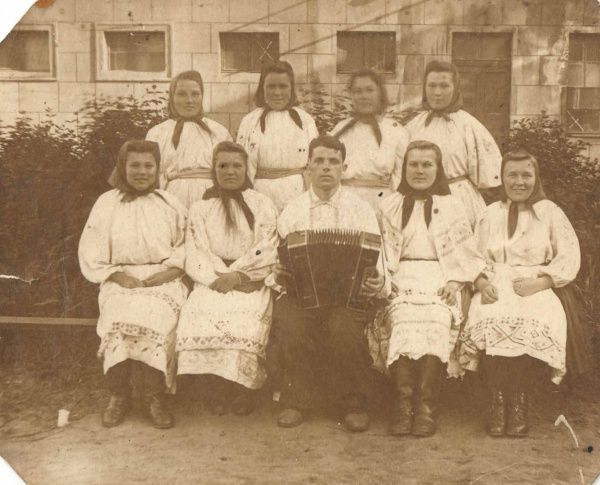 Пока шла война, самодеятельные артисты выступали только перед своими сослуживцами, а после Победы давали концерты также в городских клубах и Домах культуры. Вместе с одним из писем Иван Яковлевич прислал мне на время фотографию, сделанную 6 июня 1945 года у клуба имени Капранова. На ней в центре с баяном в руках – Отрощенко. По обе стороны стоят девчата: Зоя Семёнова, Шура Танаева, Федосия Макова, Ольга Леонтьева, Настя Чепайкина, Таня Шумилова, Аня Орехова, Ольга Сидорова.
