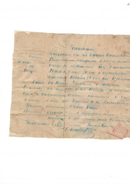 Это совершенно пожелтевший от времени, истончившийся листочек удостоверения, в котором сообщается, что «товарищ Глушков Филипп Васильевич находился в партизанском отряде по ликвидации банд в местечках Мозырь и Слуцк, за что штабом 8-й стрелковой дивизии вознагражден подарками» - стилистика документа того времени сохранена. А «за отличие в боях на Южном Уральском и Западном фронтах, за отличную связь, своевременное донесение о противнике товарищ Глушков награжден званием Почетного Красного бойца».