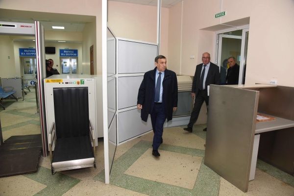 Глава региона осмотрел зал ожидания, комнату матери и ребенка, медпункт и санузел доступный для людей с ограниченными возможностями здоровья. А затем прошел по маршруту пассажиров, начиная от пункта досмотра до взлетно-посадочной полосы.