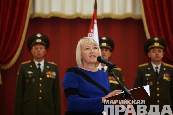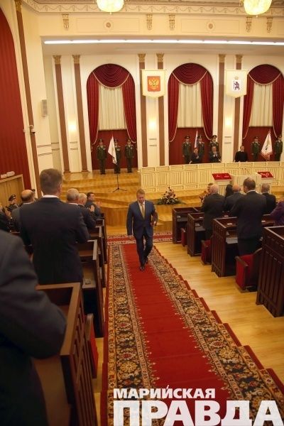 В зал внесли Государственный флаг Российской Федерации, Государственный флаг Республики Марий Эл, специальные экземпляры Конституции Российской Федерации и Конституции Республики Марий Эл, Штандарт Главы Республики Марий Эл и Знак Главы Республики Марий Эл.