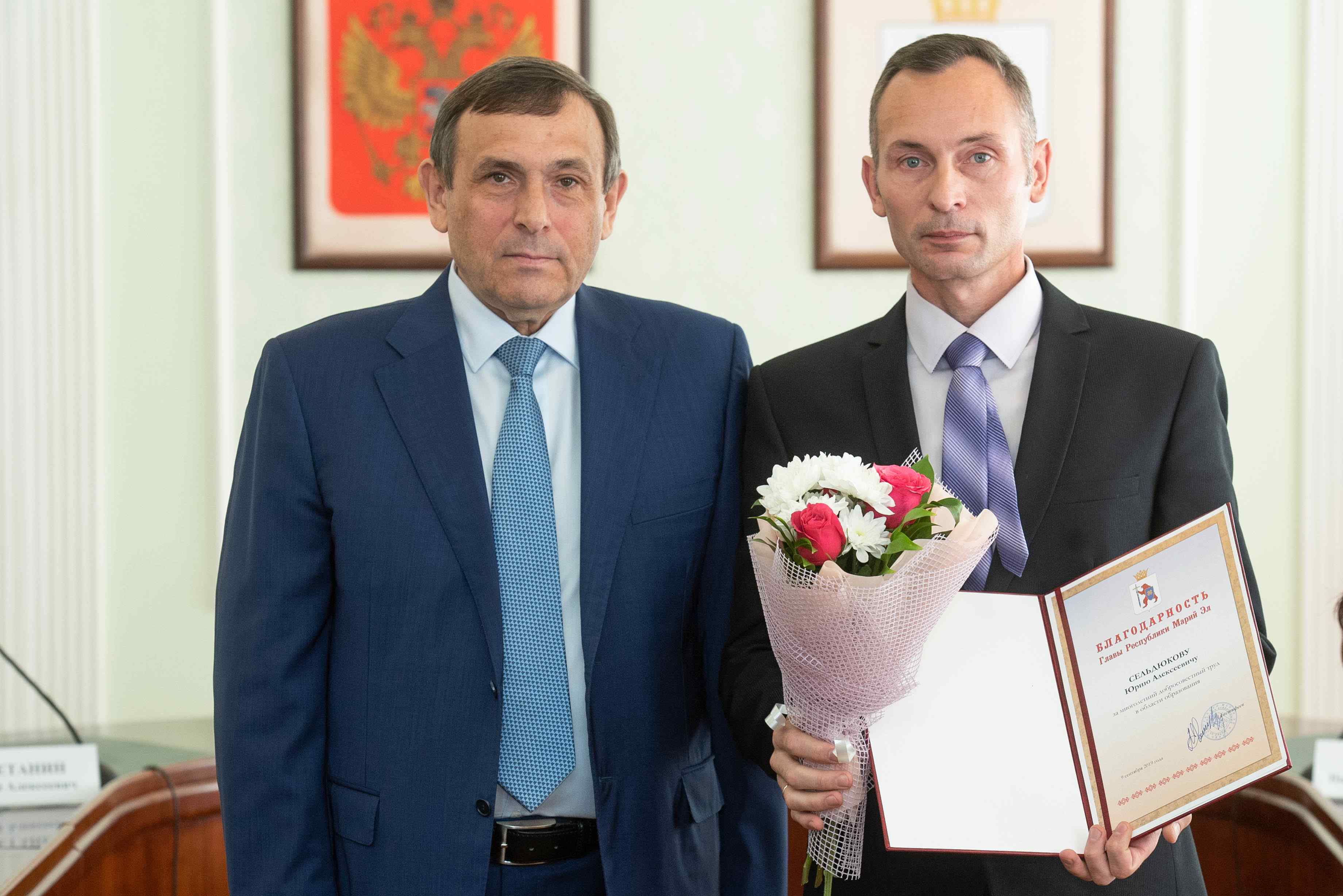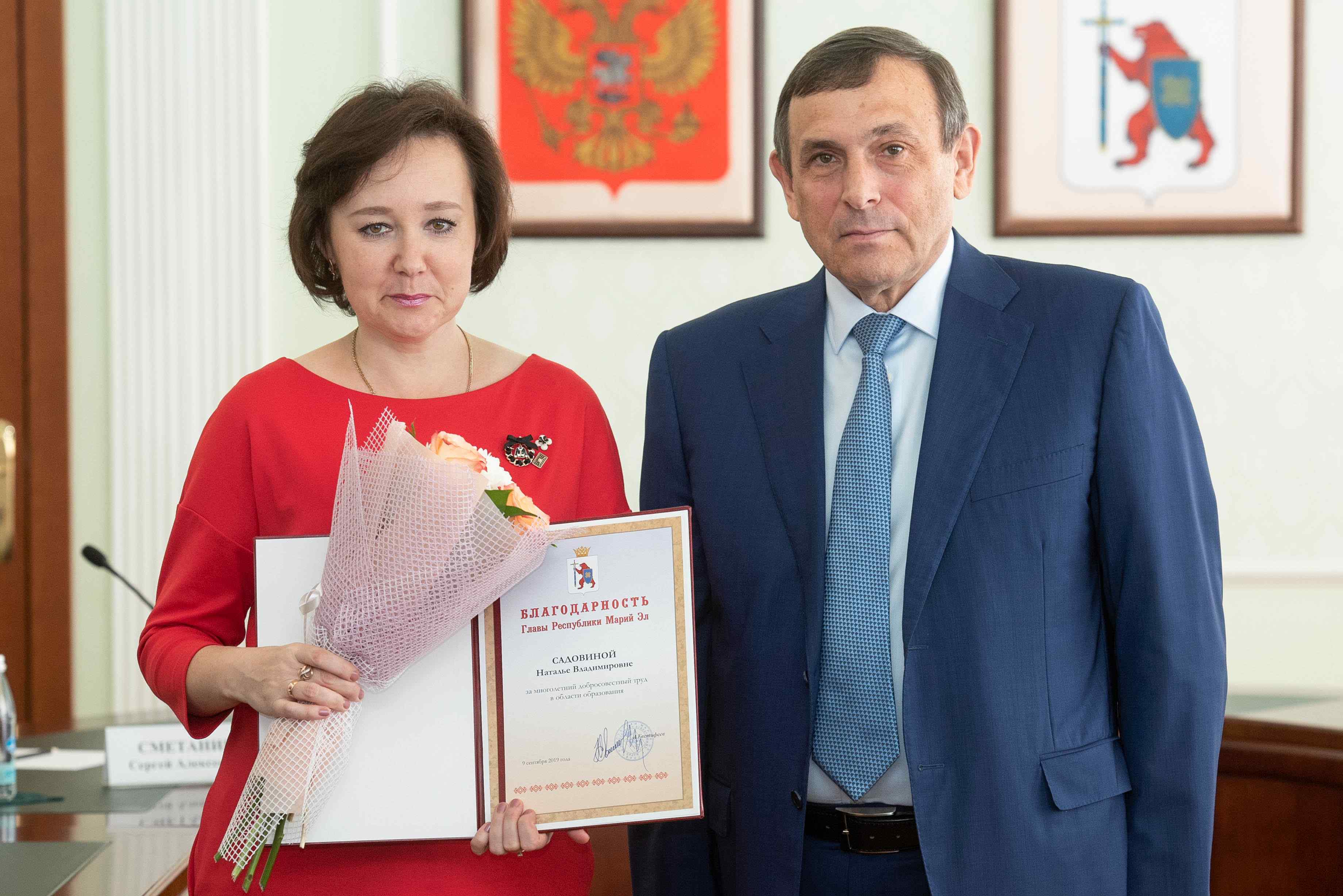 За многолетний добросовестный труд в области образования благодарность Главы республики объявлена учителю школы № 21 села Семёновка Оксане Васениной, воспитателю Медведевского детского сада № 2 «Солнышко» Ларисе Голобородько, учителю вечерней о школы № 4 Йошкар-Олы Наталье Садовиной, учителю Семеновской школы-интерната Юрию Сельдюкову и завкафедрой Марийского государственного университета Елене Карташовой.