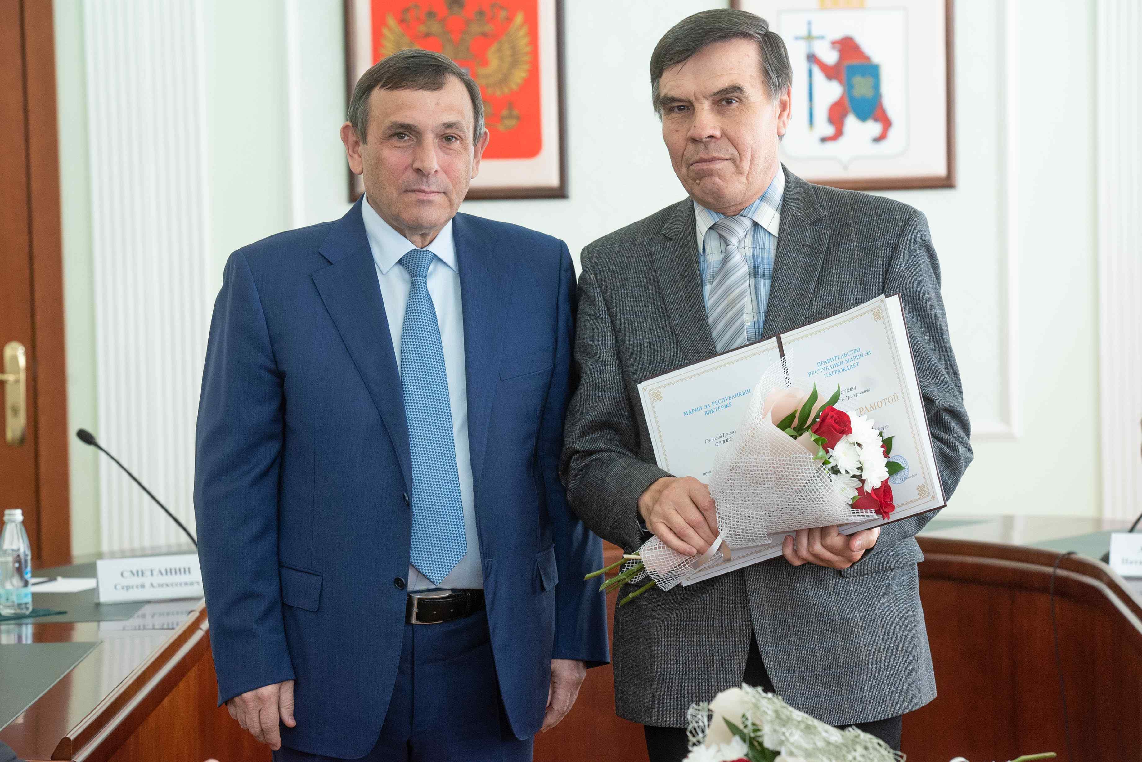 Почетные грамоты Правительства РМЭ вручили директору Шоруньжинской школы Моркинского района Сергею Григорьеву, учителю СОШ № 3 поселка Советский Ольге Костюниной и преподавателю Автодорожного техникума Медведевского района Марий Эл Геннадию Орлову.