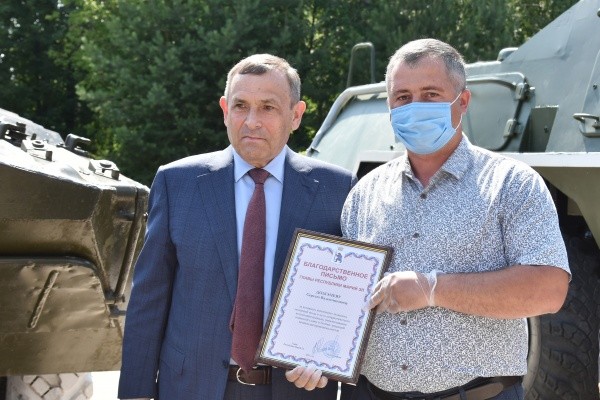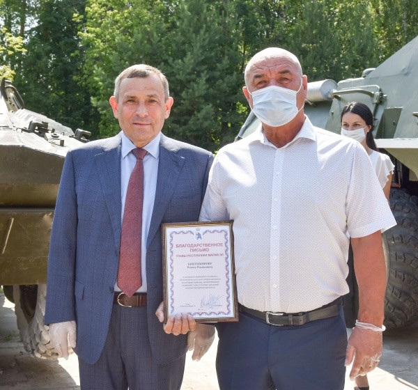 Глава Марий Эл отметил старания неравнодушных волжан и наградил самых активных благодарностями. Их получили предприниматели Ринат Биктимиров и Сергей Долгачев, а также ветеран боевых действий Андрей Григорьев."Боевая машина много лет несла и гражданскую службу – в пожарной охране. Поэтому когда она прибыла в город, то была окрашена в красный цвет. Наши афганцы проделали большой труд, чтобы придать ей вид настоящей боевой машины. В этом им помогли и представители бизнеса," - пояснил Евгений Лебедев.