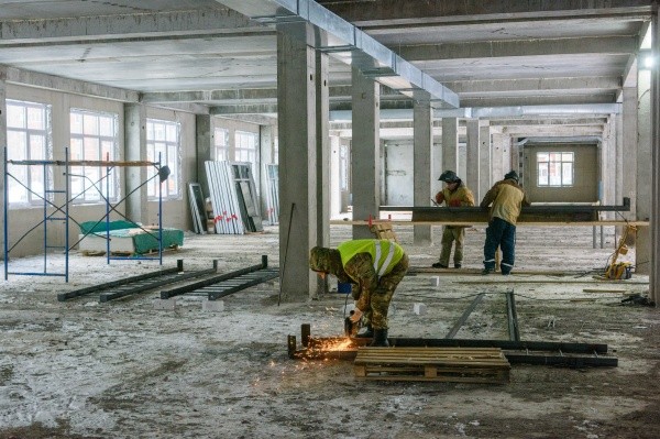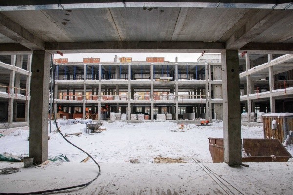 На сегодняшний день на объекте выполнены подготовительные работы, смонтированы железобетонный каркас и сборные железобетонные плиты перекрытия. Ведутся работы по монтажу стеновых панелей, внутренних инженерных систем, оконных блоков.