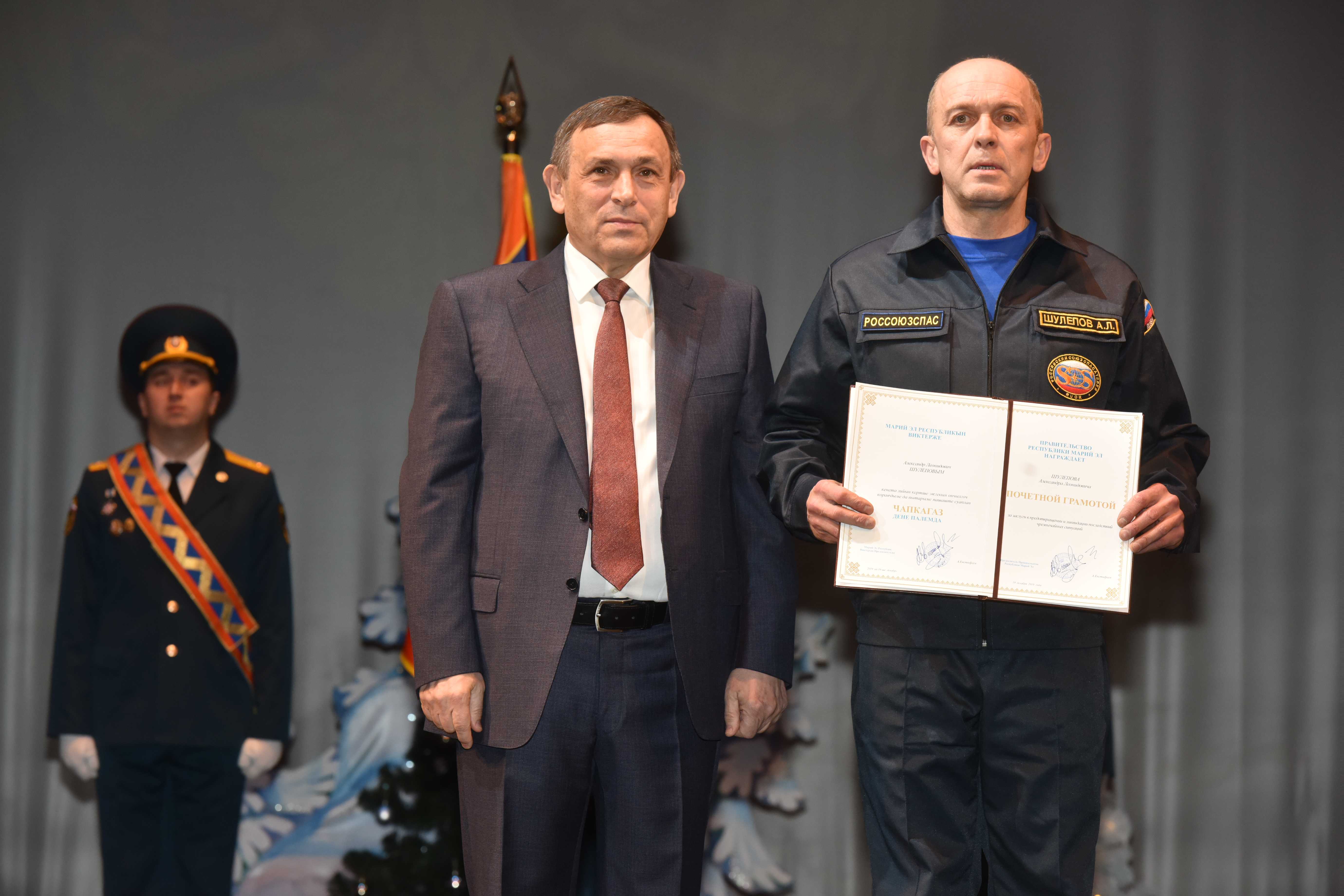 За заслуги в предотвращении и ликвидации последствий чрезвычайных ситуаций Почетной грамотой Правительства Марий Эл награждены: спасатель Центрального аварийно-спасательного отряда Марийской аварийно-спасательной службы Алексей Калинин, начальник пожарной части №51 ОГПС-3 Управления Государственной противопожарной службы Республики Виталий Федоров, спасатель 1-го класса Йошкар-Олинской аварийно-спасательной служба Александр Шулепов.
