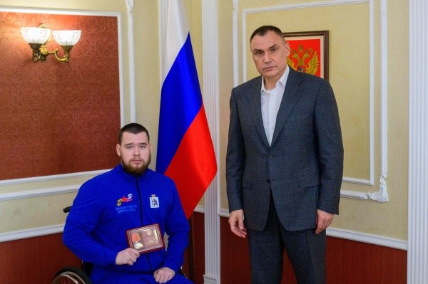 На встрече с параспортсменами Юрий Зайцев наградил государственными наградами: медалью Жукова и медалью Суворова ветерана СВО – Валерия Кузовкова за отвагу, самоотверженность и личное мужество, проявленные в боевых действиях при защите Отечества и государственных интересов Российской Федерации.