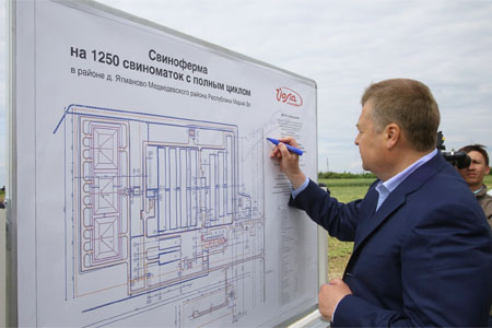 Глава Марий Эл Леонид Маркелов оставил памятную надпись на проекте строительства свинокомплекса. Ставя роспись, Глава региона подчеркнул, что правительство республики будет поддерживать инвестора в реализации проекта.