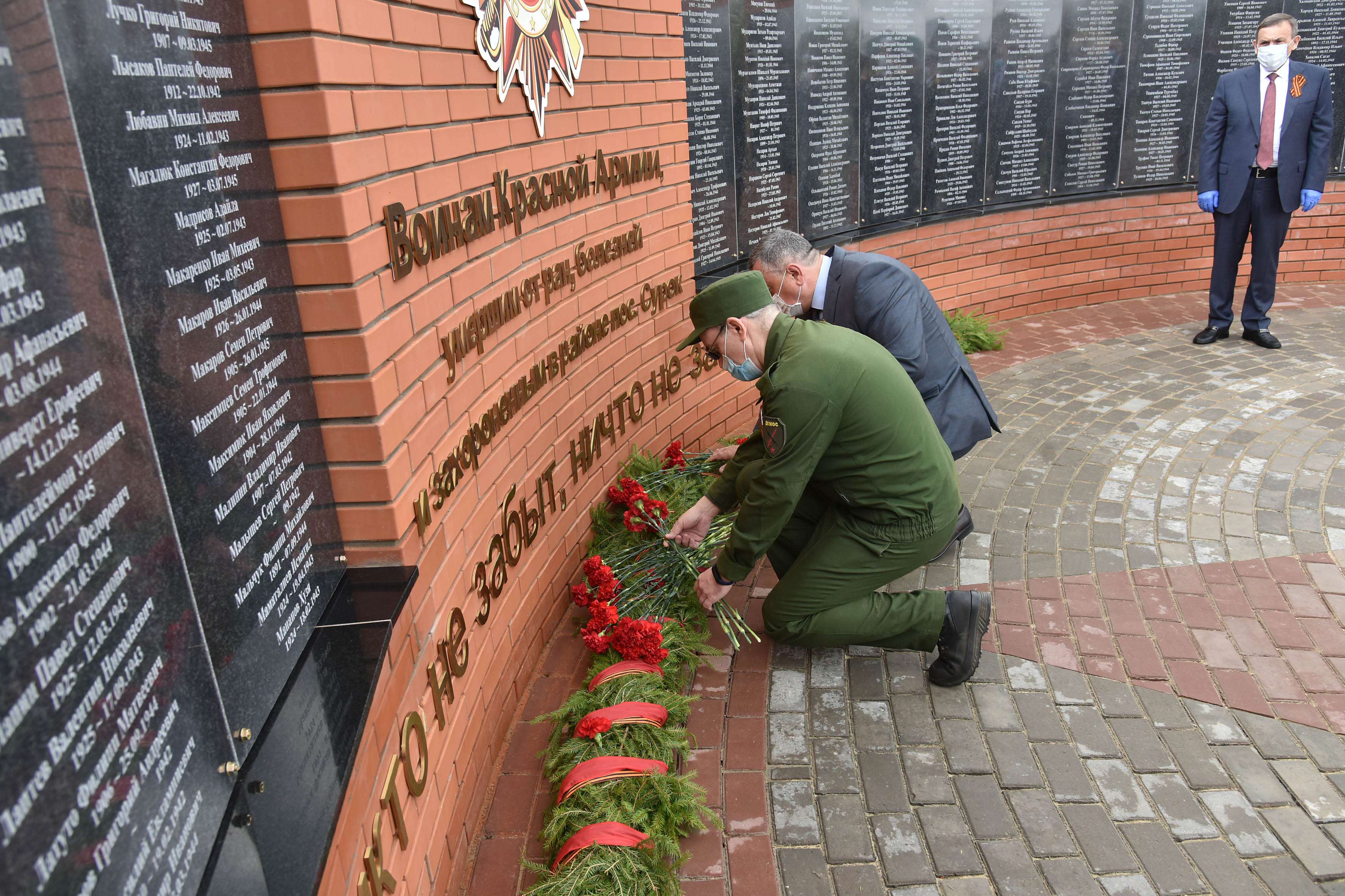 На гранитных плитах увековечены имена 555 военнослужащих, умерших от ран и болезней в эвакуационных госпиталях на территории республики во время Великой Отечественной войны и захороненных в районе поселка Сурок.