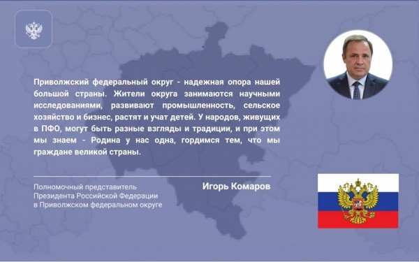 Полномочный представитель Президента РФ в Приволжском федеральном округе Игорь Комаров поздравил жителей ПФО с Днем народного единства.