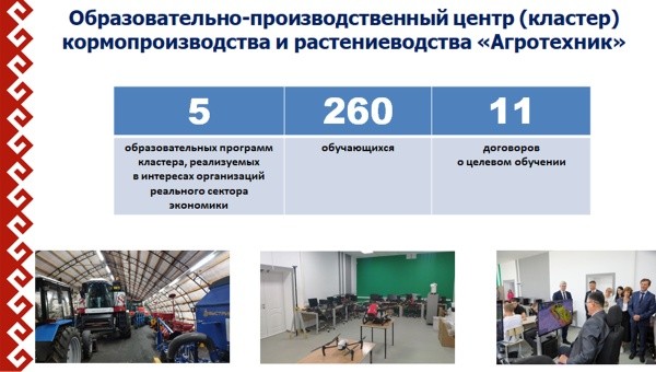 В рамках федерального проекта «Профессионалитет» в Марий Эл в 2023 году был создан образовательно-производственный кластер в сельском хозяйстве. В текущем году реализуется образовательно-производственный кластер в сфере радиоэлектроники, с 1 сентября в новом кластере начнут обучаться 325 школьников по 8 образовательным программам. В 2025 году в республике будут созданы образовательно-производственные кластеры для строительной и транспортной отраслей экономики республики.Недавно Глава Марий Эл и директор Ассоциации кластеров, технопарков и особых экономических зон России подписали соглашение о сотрудничестве.