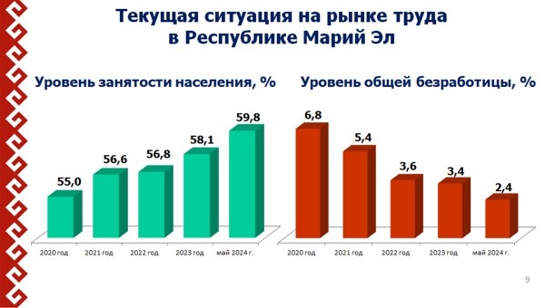 В Марий Эл отмечено снижение уровня регистрируемой безработицы. На первое июля численность безработных граждан составила 1197 человек, что на 5% меньше данного показателя на начало года. Также в республике отмечается положительная динамика уровня занятости населения – в мае 2024 года этот показатель составил 59,8%. В прошлом году 820 человек прошли профессиональное обучение или получили дополнительное профессиональное образование в рамках национального проекта «Демография».