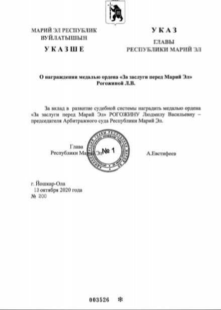 На сайте Правительства республики появился новый Указ, подписанный Александром Евстифеевым. В нем говорится, что за вклад в развитие судебной системы медалью ордена «За заслуги перед Марий Эл» награждается председатель регионального Арбитражного суда Людмила Васильевна Рогожина.