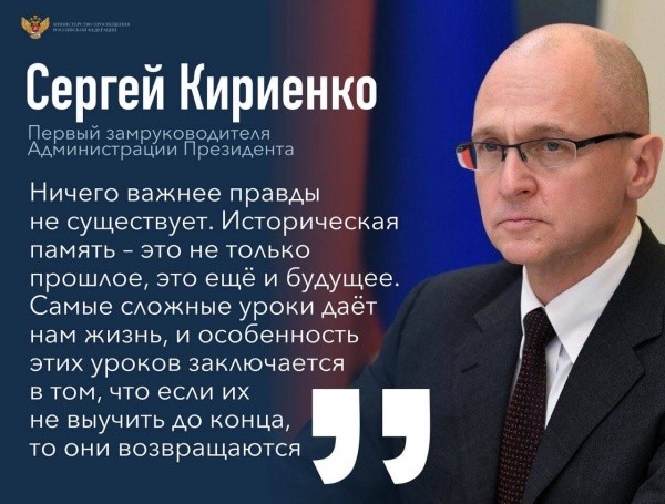 "Историческая правда является главным оружием в борьбе с нацизмом. Советский Союз уже выполнял эту историческую миссию нашего народа, мы один раз уже обеспечили победу над нацизмом. Наш народ, наша страна точно сделает все, для того чтобы нацизм никогда больше не смог поднять голову не только у нас, в России, но и нигде в мире", - приводит слова Сергея Кириенко ТАСС.