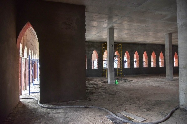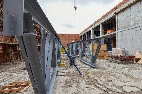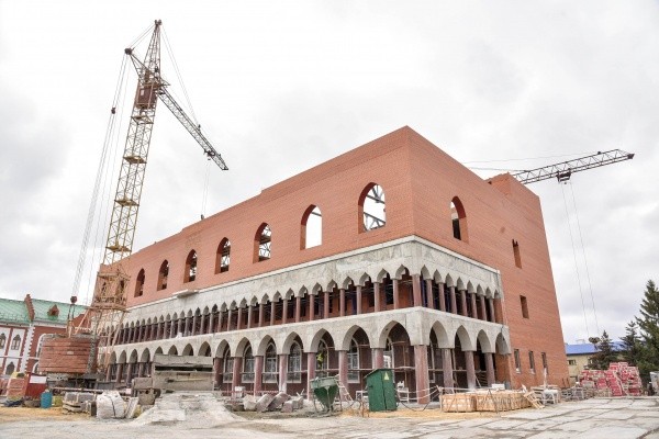 На стройплощадке трудятся больше 45 человек, которые сейчас занимаются кирпичной кладкой стен 4 этажа. Тем временем устройство монолитных колонн и стен выполнено полностью. Также ведется облицовка фасада камнем, монтаж, оконных блоков и металлических ферм, устройство системы вентиляции, ведутся отделочные и сантехнические работы. В декабре в здании будет тепло.
