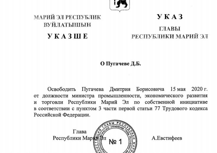 Дмитрий Пугачев, занимавший должность министра промышленности, экономического развития и торговли Марий Эл, ушел с нее по собственному желанию.