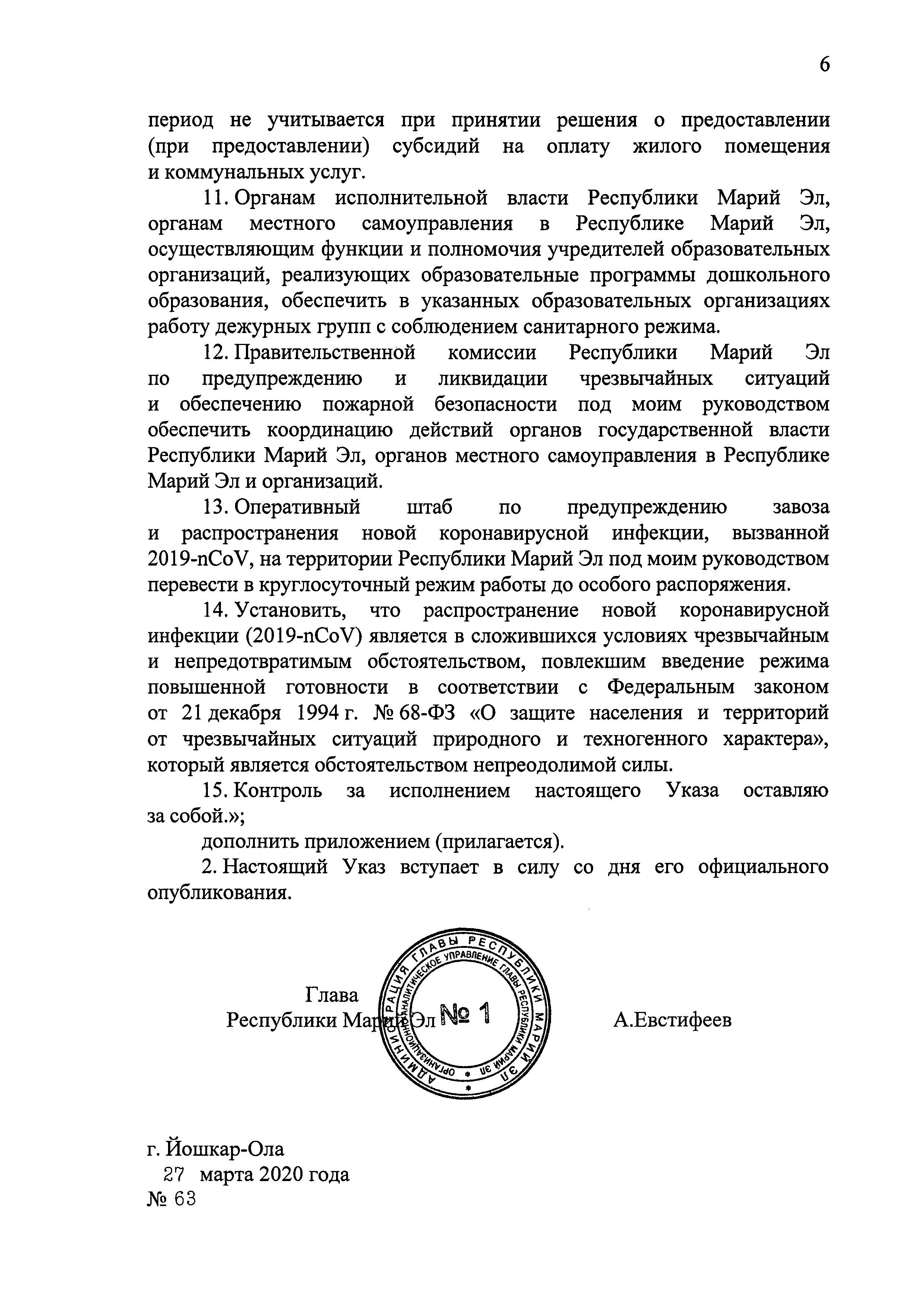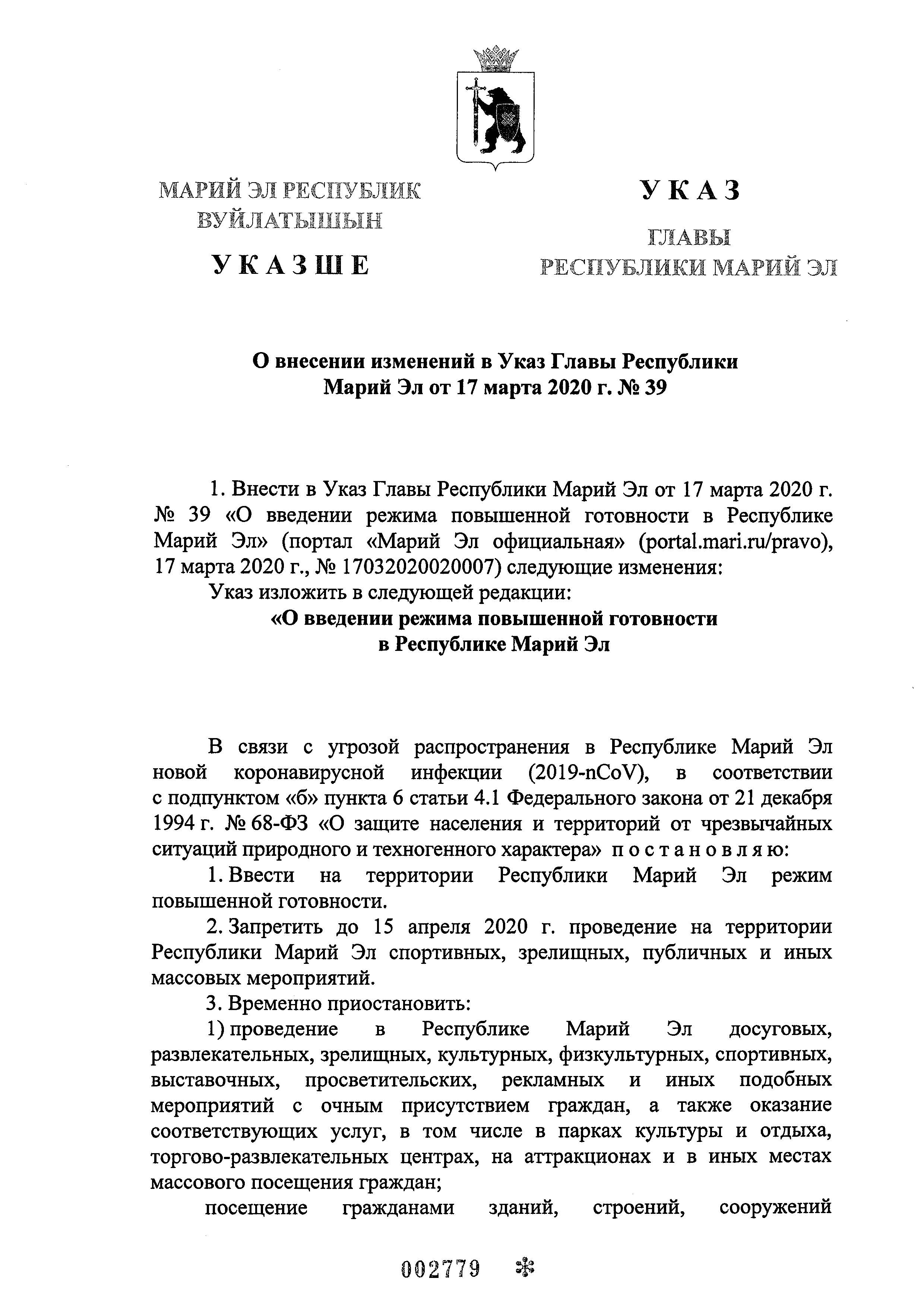 Сегодня, 27 марта, указом Главы Марий Эл внесены изменения в Указ «О введении режима повышенной готовности в Республике Марий Эл». В дополнение к уже действующим из-за угрозы распространения новой коронавирусной инфекции (2019-пСоУ) на территории региона водятся новые ограничения, направленные на сохранение здоровья людей.