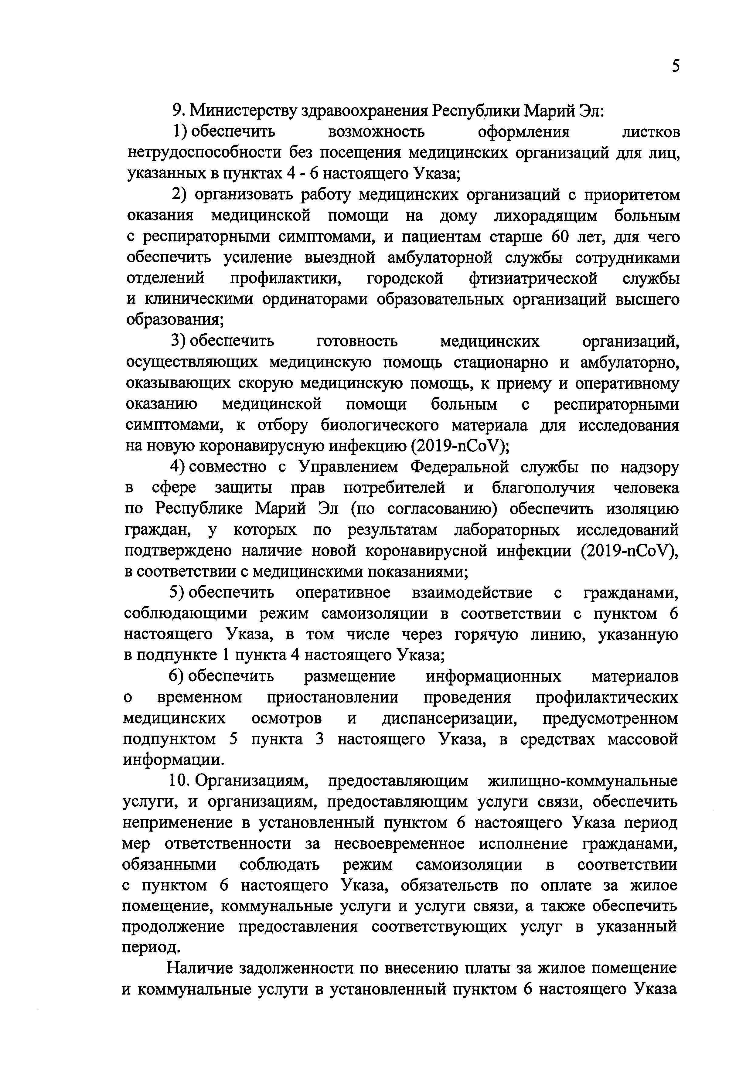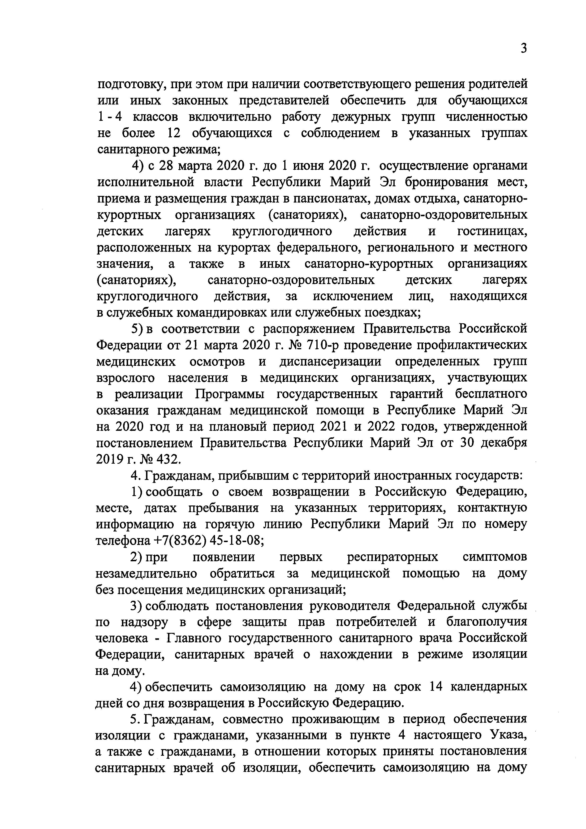 Приостановлено осуществление органами исполнительной власти Республики Марий Эл бронирования мест, приема и размещения граждан в пансионатах, домах отдыха, санаторно-курортных организациях (санаториях), санаторно-оздоровительных детских лагерях круглогодичного действия и гостиницах, расположенных на курортах федерального, регионального и местного значения, а также в иных санаторно-курортных организациях (санаториях), санаторно-оздоровительных детских лагерях круглогодичного действия, за исключением лиц, находящихся в служебных командировках или служебных поездках;