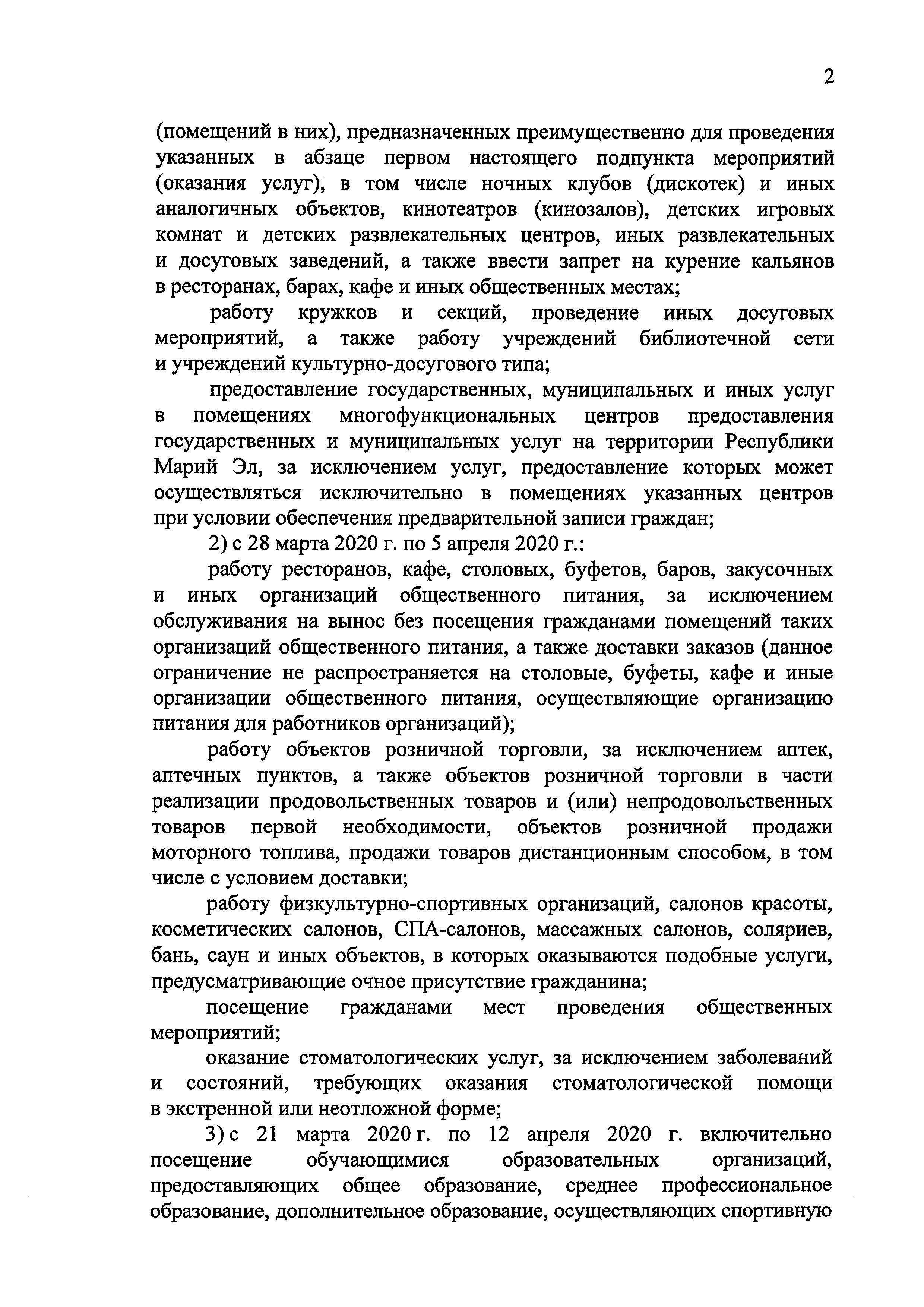 Приостановлена работа кружков и секций, проведение иных досуговых мероприятий, работа учреждений библиотечной сети и учреждений культурно-досугового типа; предоставление государственных, муниципальных и иных услуг в помещениях многофункциональных центров предоставления государственных и муниципальных услуг на территории Республики Марий Эл, за исключением услуг, предоставление которых может осуществляться исключительно в помещениях указанных центров при условии обеспечения предварительной записи граждан.