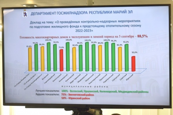 Министр строительства, архитектуры и ЖКХ Марий Эл Михаил Степанов сообщил, что в соответствии с планом-графиком на сегодняшний день к отопительному сезону подготовлено 4193 многоквартирных дома, 500 котельных, 669 км тепловых сетей. Водопроводные, канализационные и электрические сети готовы почти на 100%.