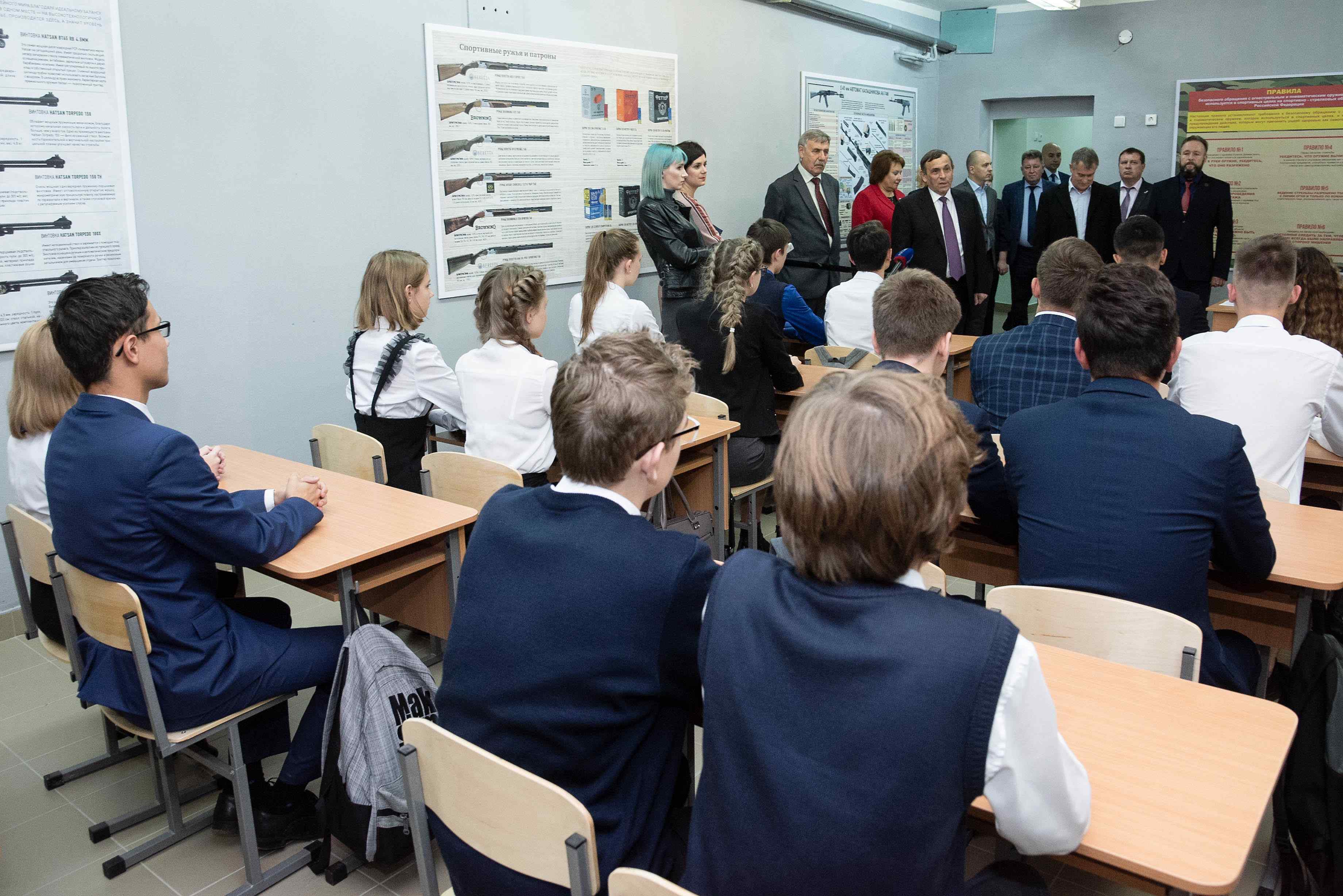 Глава Марий Эл после церемонии открытия стрелкового тира зашел в класс для теоретических занятий и обратился к сидевшим за партами воспитанникам секции по пулевой стрельбе: