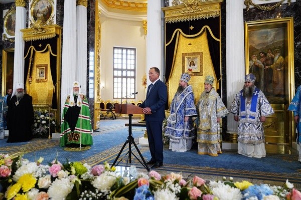 Игорь Комаров зачитал приветствие от имени Президента России Владимира Путина, в котором глава государства отметил, что восстановление собора на месте обретения одной из самых почитаемых православных святынь – чудотворной Казанской иконы Божией Матери – это большое и долгожданное событие для верующих, прихожан и паломников, для всех, кто глубоко чтит завещанные предками духовные, нравственные идеалы, кому дорого бесценное историческое наследие нашего народа.«Мы с вами стоим в грандиозном храме, который построен на народные средства, построенный потому, что люди того желали. Невозможно было заглушить ростки духовной жизни, произраставшие из глубины веков. Мы сегодня с вами свидетели того, как на том месте, где не предполагалось вообще никаких проявлений религиозной жизни, освящен этот величественный кафедральный собор, как памятник духу, мужеству, силы и веры нашего народа», - сказал собравшимся Патриарх Кирилл.
