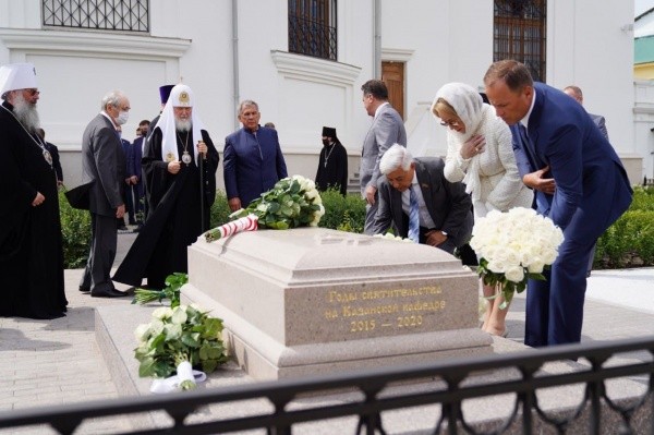 По окончании торжественного мероприятия состоялось возложение цветов на могилу Митрополита Казанского и Татарстанского Феофана.«Воссоздание знаменитого православного собора наравне с возрождением мусульманских святынь древнего города стало для татарстанцев долгом памяти и чести», - сказал президент Татарстана Рустам Минниханов.