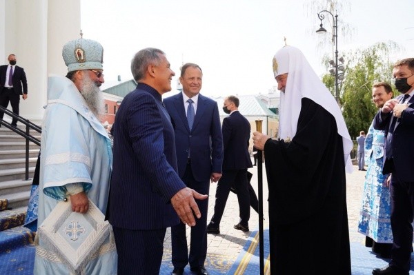 Сегодня, 21 июля, в столице Татарстана состоялась торжественная церемония освящения воссозданного собора Казанской иконы Божией Матери Богородицкого монастыря. В мероприятии приняли участвовали Патриарх Московский и всея Руси Кирилл, Председатель Совета Федерации Валентина Матвиенко, полномочный представитель Президента РФ в ПФО Игорь Комаров, президент Республики Татарстан Рустам Минниханов и первый глава Республики Минтимер Шаймиев.