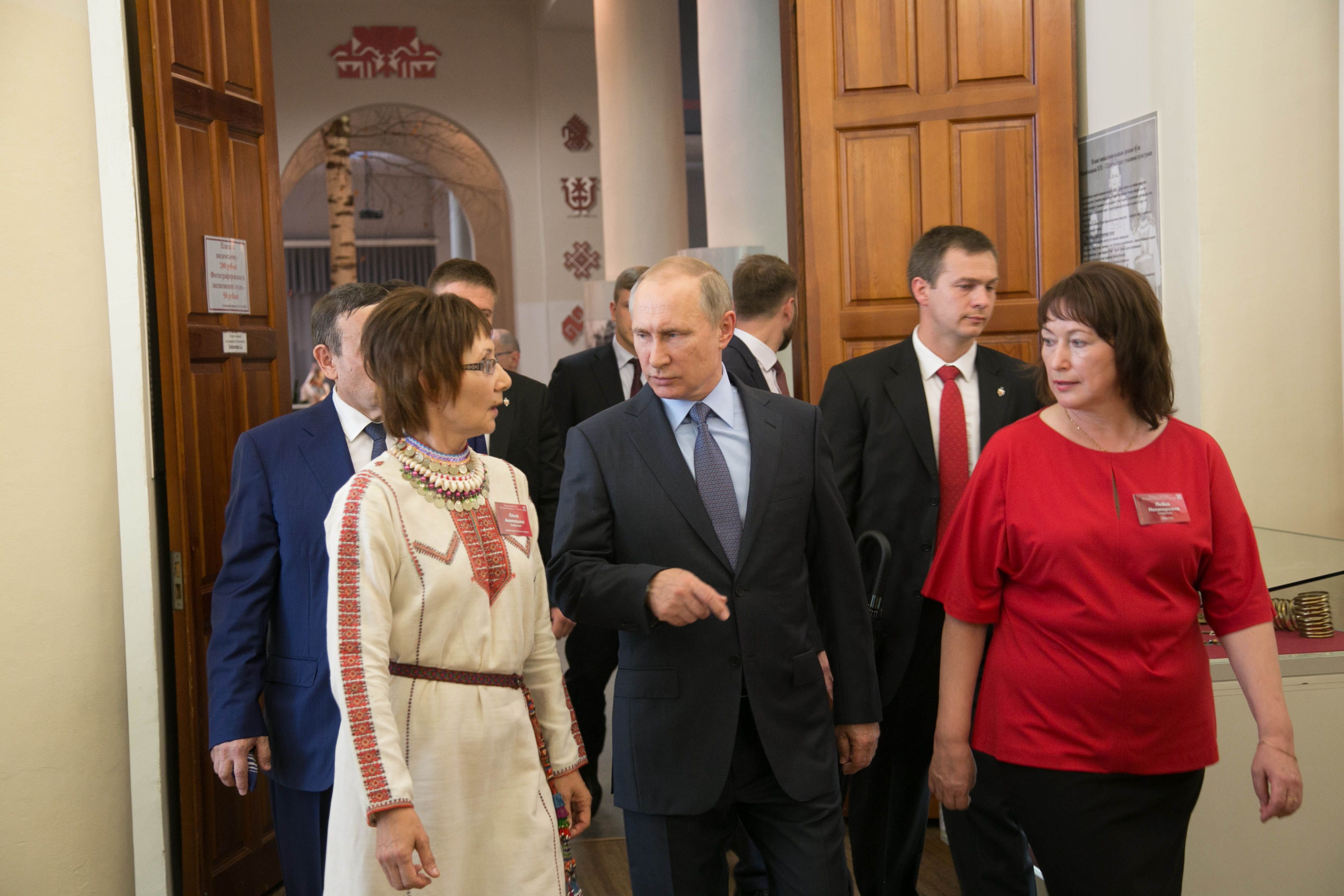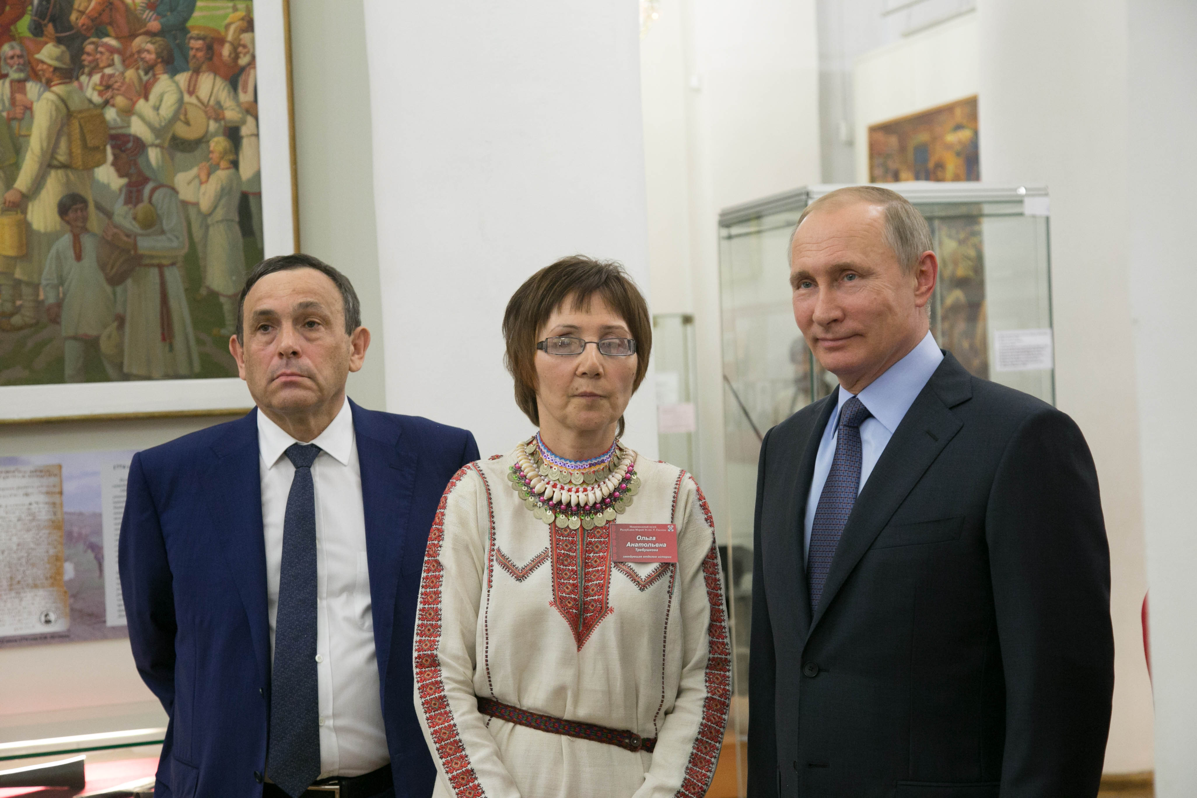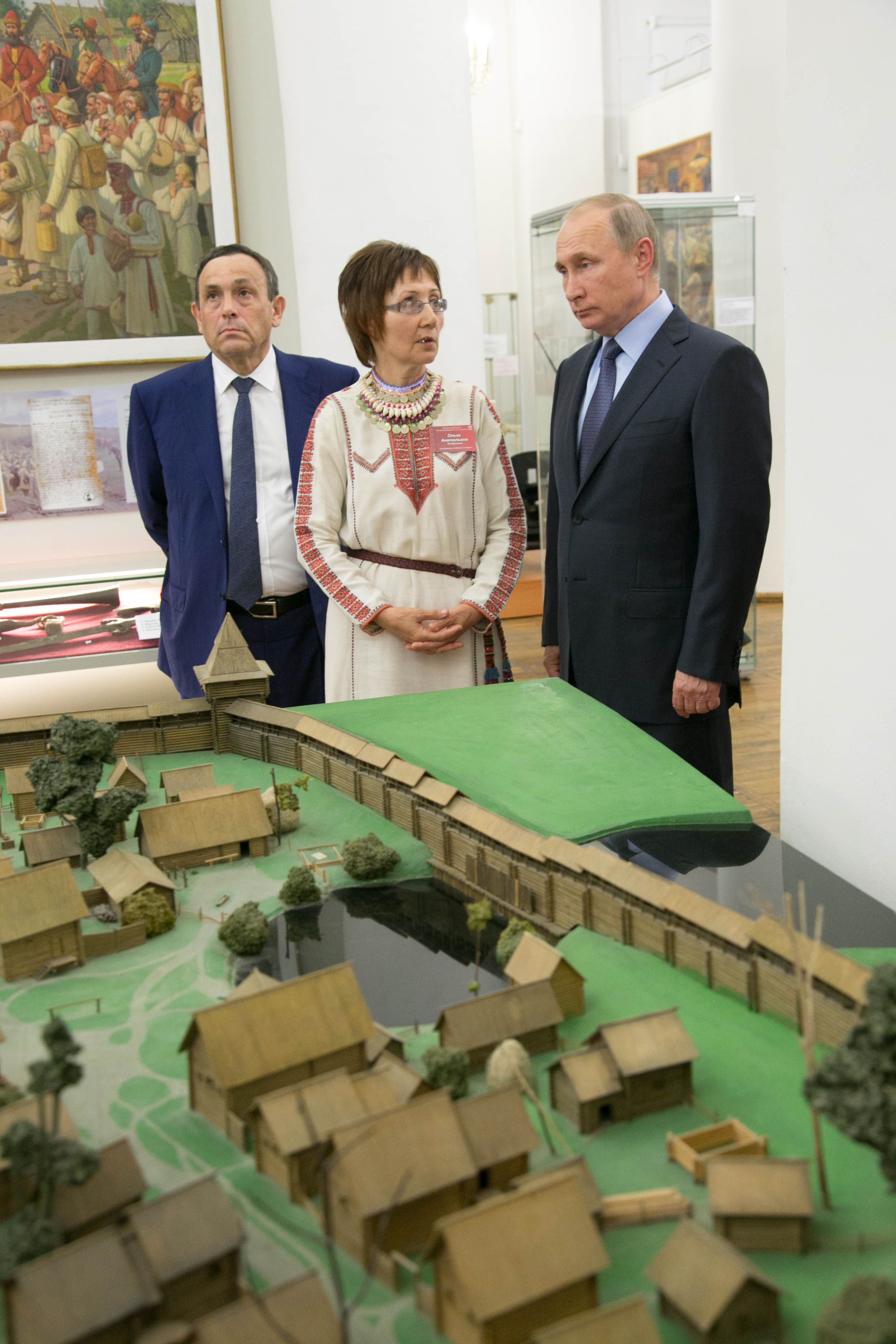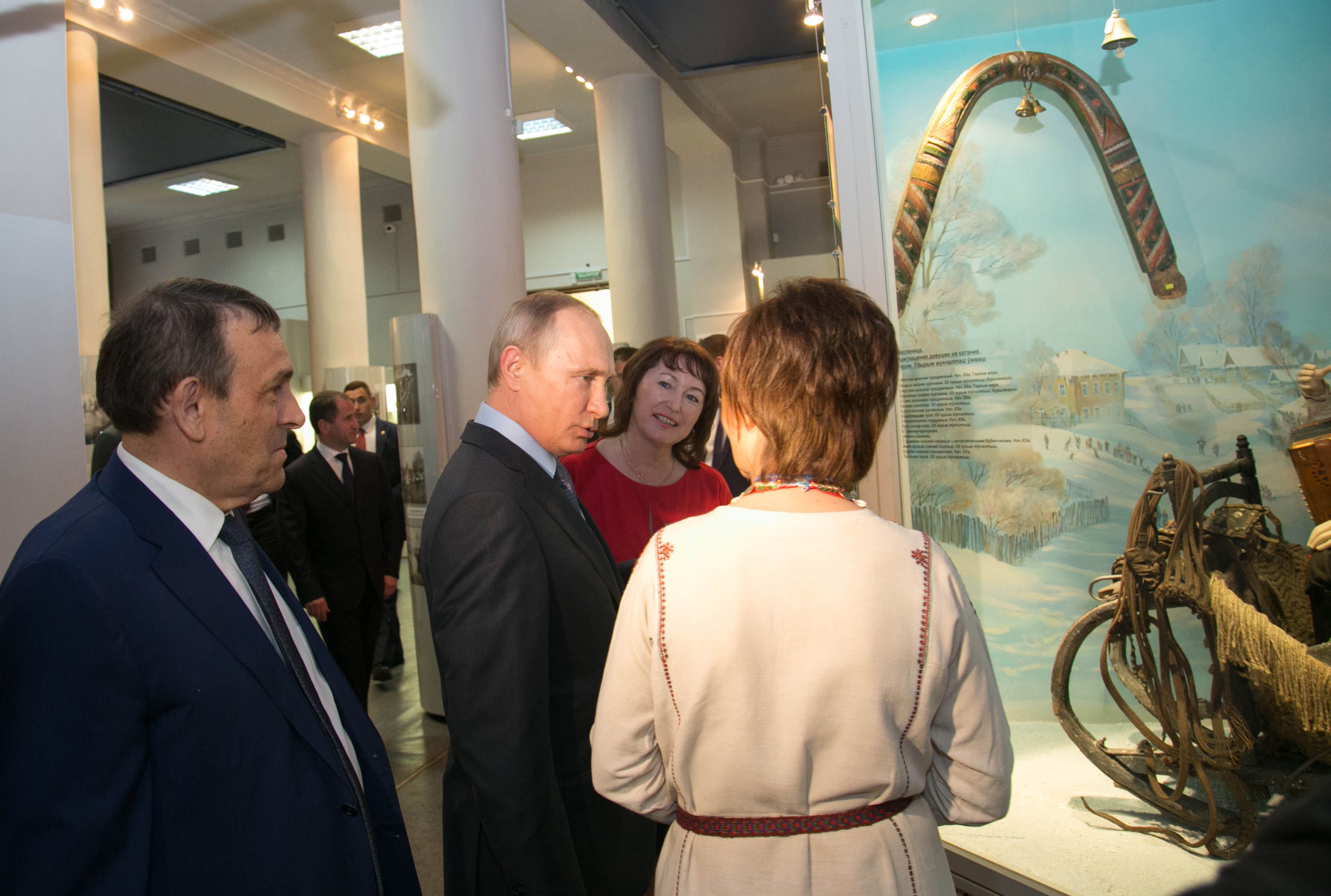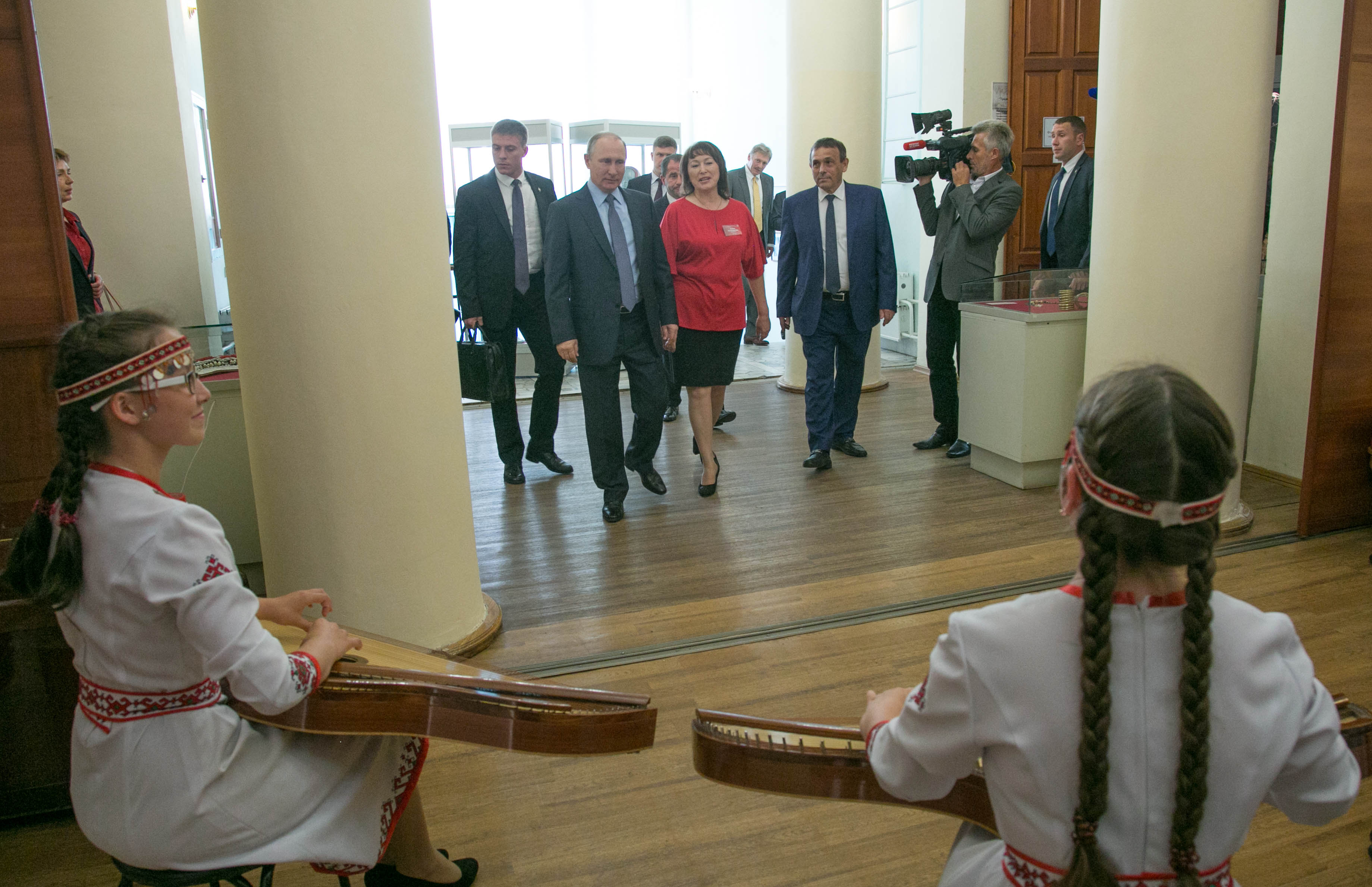 Президента страны в музее встретили исполнительницы на многострунных национальных инструментах – девушки-гусляры. Для главы государства они исполнили марийскую народную инструментальную музыку. Владимир Путин осмотрел экспозицию, рассказывающую об истории марийского народа - с древних времен до окончания советского периода. Экскурсовод рассказала Президенту России о традициях, обрядах и верованиях марийцев, отметив их «интересное мировоззрение и необыкновенную толерантность к другим народам».