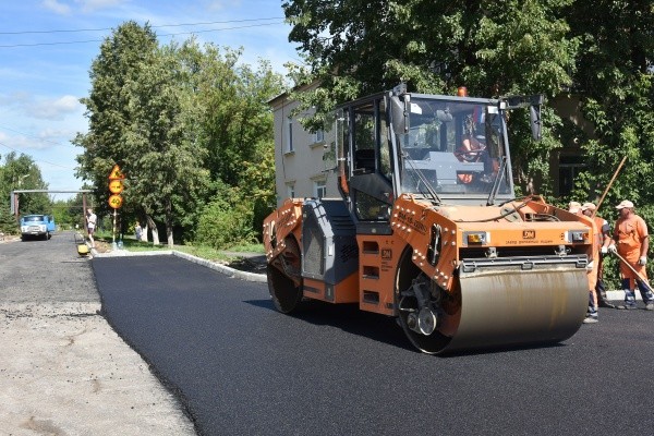 На соседней улице Советской строительные работы находятся в самом разгаре: установлены бордюры, уложен выравнивающий слой асфальта, идёт укладка верхнего слоя. Здесь ремонтируют дорогу по нацпроекту «БКД».