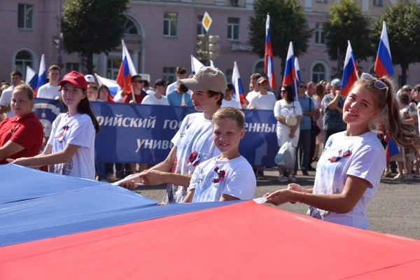 Колонна пронесла флаг по улице Первомайской и Ленинскому проспекту - от улицы Кремлевской до площади им. В.И. Ленина, где прошли торжественный митинг и концерт. В шествии приняли участие волонтеры, кадеты, юнармейцы, студенты, сотрудники учреждений и общественных организаций города.