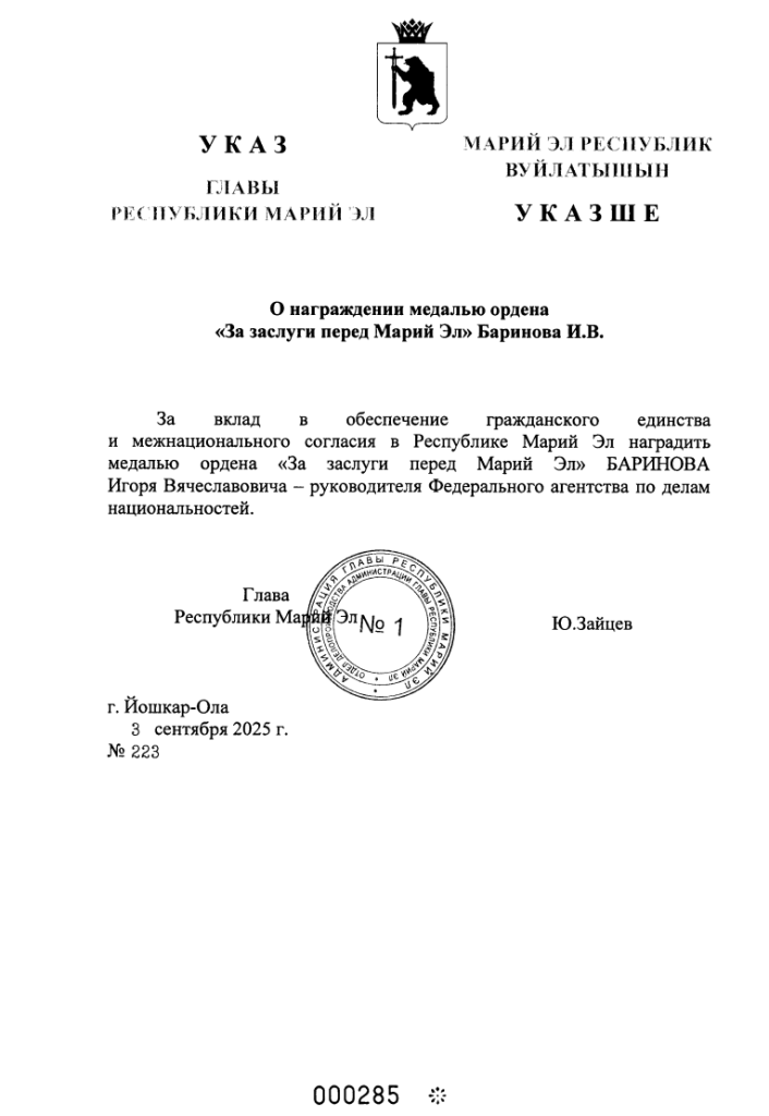 За вклад в обеспечение гражданского единства и межнационального согласия в Марий Эл наградят медалью ордена «За заслуги перед Марий Эл» руководителя Федерального агентства по делам национальностей Игоря Вячеславовича Баринова. Об этом говорится в указе, подписанном Главой региона Юрием Зайцевым.