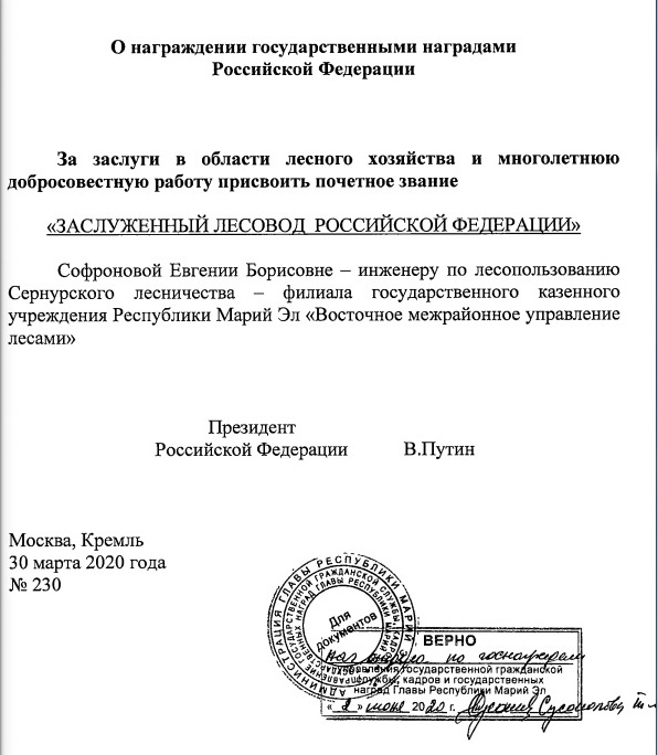 Указом Президента РФ Владимира Путина награждена сотрудница Сернурского лесничества Евгения Софронова.