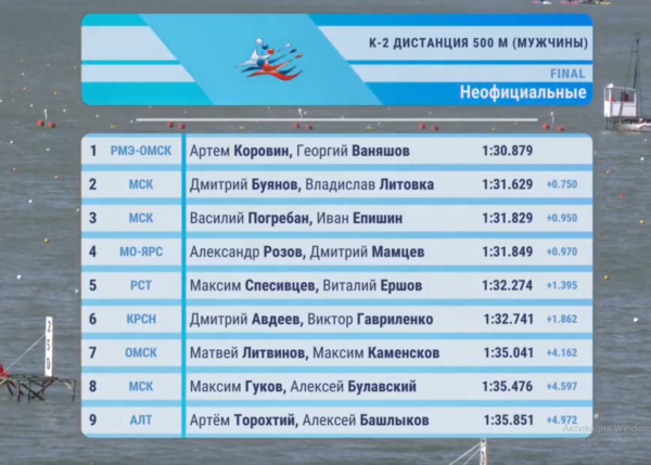 Коровин и Ваняшов с первых метров вышли вперед и при сильном южном ветре смогли не только сохранить лидирующую позицию, но и обеспечить спокойный финиш. На "ленточке" их преимущество перед вторыми призерами – Владиславом Литовкой и Дмитрием Буяновым из Москвы составило 0,75 секунды. Третьей финишировала еще одна московская двойка – Иван Епишин и Василий Погребан.