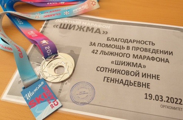 В Кировской области Инна Сотникова также приняла участие в 42-м лыжном марафоне «Шижма» в качестве спортивного судьи, отметив высокий уровень организации соревнований. Домой она вернулась с подарками – красочными медалями и атрибутикой марафона «Шижма».