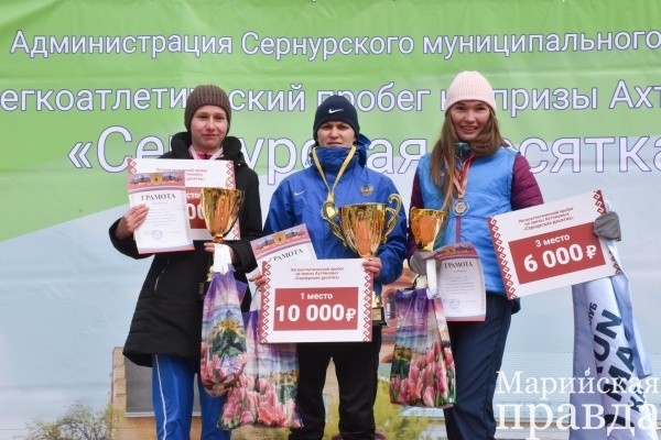В группе спортсменов до 30 лет первые места заняли Роман Важенин и Мария Киселева, до 39 лет - Евгений Гурьев и Снежана Петрова. Алексей Матвеев и Татьяна Рослякова выиграли зачет среди участников 40-49 лет. У бегунов старшего возраста победителями "Сернурской десятки" стали Валерий Цветнов, Татьяна Агачева, Вячеслав Чемеков, Валерий Токтаров и Валериан Романов.