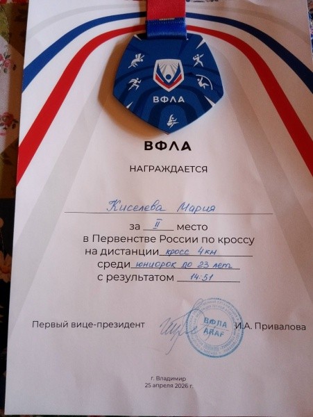 Легкоатлетка Мария Киселева заняла второе место на первенстве страны по кроссу. Соревнования прошли во Владимире 25 апреля, в субботу. Среди юниорок до 23 лет подопечная тренера Константина Лукьянова показала результат 14 минут 51 секунда.