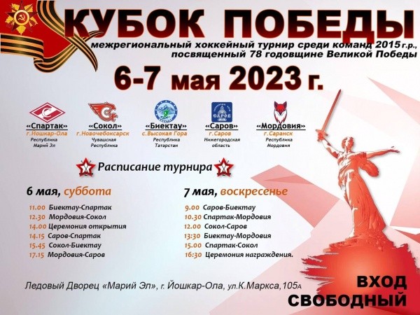 Межрегиональный хоккейный турнир "Кубок Победы", посвященный 78-ой годовщине Победы в Великой Отечественной войне, пройдет в Йошкар-Оле 6 и 7 мая.