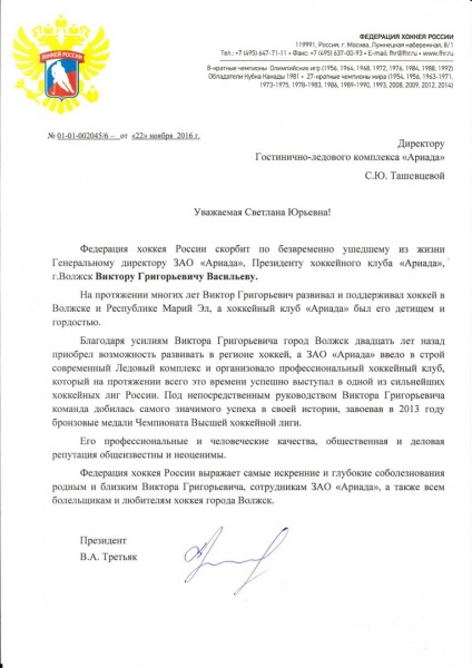 «Федерация хоккея России скорбит по безвременно ушедшему из жизни Генеральному директору ЗАО «Ариада», Президенту хоккейного клуба «Ариада» г. Волжск Виктору Григорьевичу Васильеву.