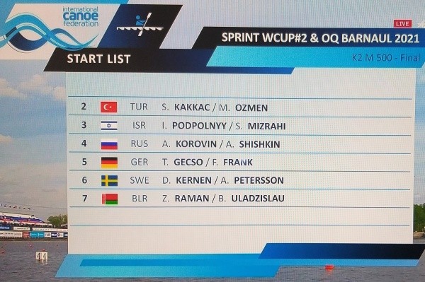 500 метров. К-2. Мужчины. Финал «А». 1. RAMAN, Zakharanka, ULADZISLAU, Belaus (Беларусь) – 01:37.959. 2. KERNEN, Dennis, PETERSSON, Albert (Швеция) – 01:38.168. 3. KOROVIN, Artem, SHISHKIN, Alexey (Россия) - 01:38.621. 4. GECSO, Tamas, FRANK, Felix (Германия) - 01:40.720. 5. PODPOLNYY, Ilya, MIZRAHI, Stav (Израиль) - 01:42.222. 6. KAKKAC, Serkan, OZMEN, Mustafa (Турция) - 01:42.686.