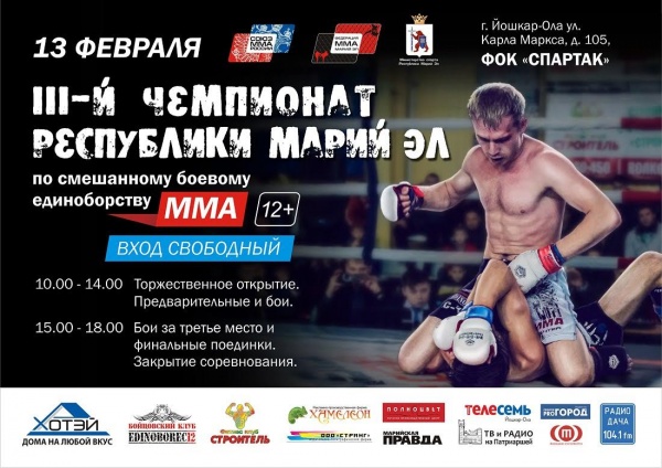 Откроет бойцовский год чемпионат Марий Эл по смешанному боевому единоборству, который начнется в ФОКе «Спартак» 13 февраля в 10 часов. Самое интересное – битва за призовые места – начнется в 15 часов. По итогам этих соревнований будут выявлены лучшие бойцы республики, которые представят Марий Эл на чемпионате Приволжского Федерального округа.