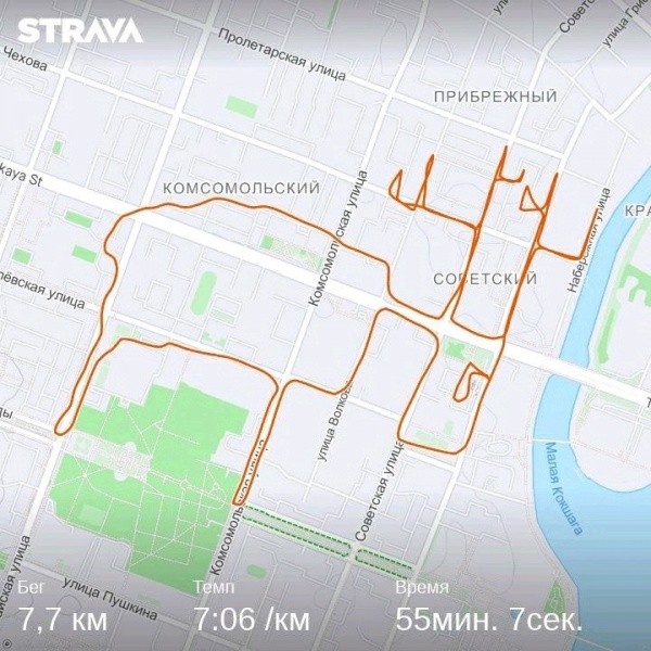 Участники мероприятия вместе пробежали 7,7 километров почти за час и нарисовали милого лося. Через его спину и до самой головы проходит улица Красноармейская, а копытами он буквально «стоит» на Центральном парке.