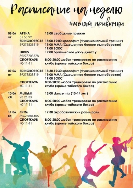 На следующей неделе  - с 5 по 11 июня - планируются тренировки по кроссфиту, ММА, боксу, бразильскому джиу-джитсу, акробатическому рок-н-роллу. Для того, чтобы попасть на бесплатное занятие, нужно записаться по указанному в афише телефону и упомянуть, что хотите посетить его по акции  #меняй_привычки