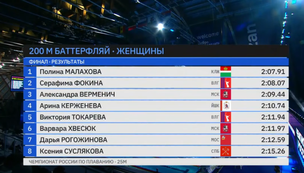 От бронзы, которую выиграла москвичка Александра Верменич (2:09,44), талантливую пловчиху отделили 1,3 секунды. Второе место заняла победительница предварительных заплывов Серафима Фокина из Волгоградской области – 2:08,07. Чемпионкой страны стала Полина Малахова из Калужской области – 2:07,91.